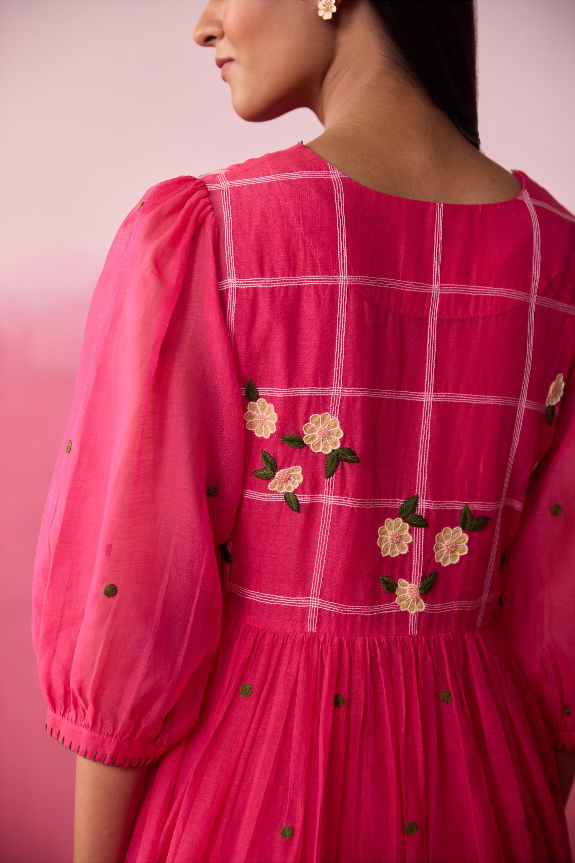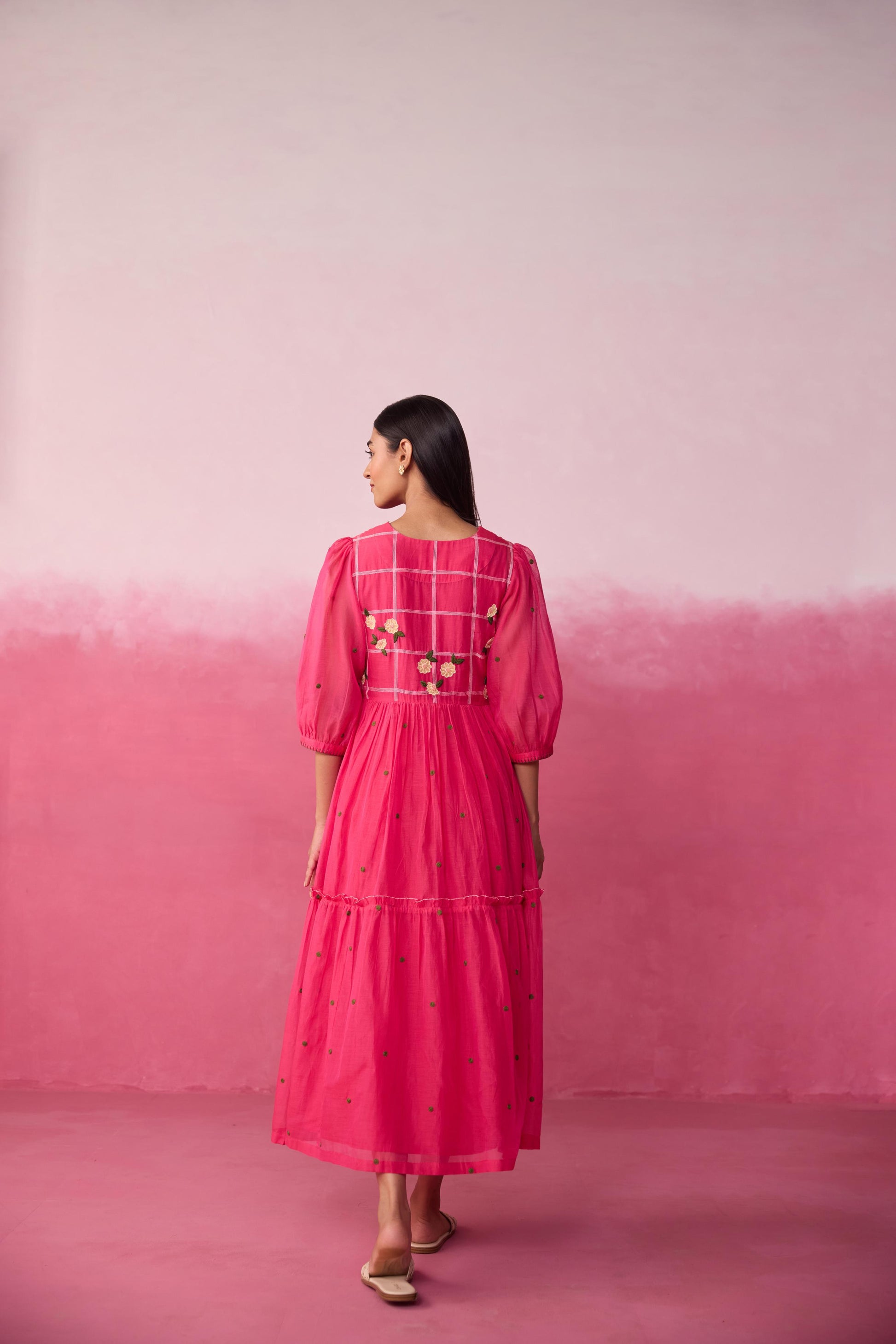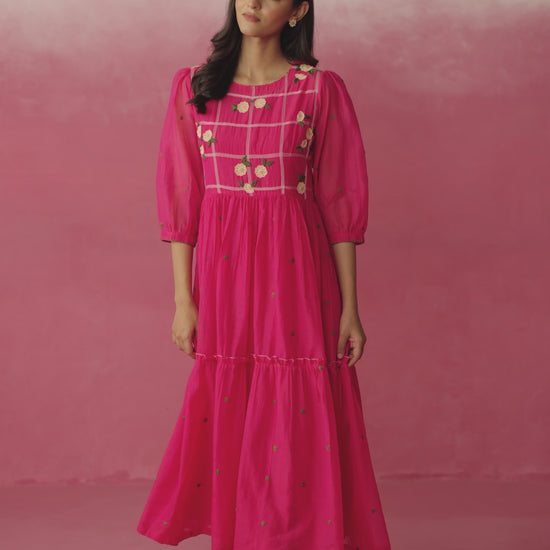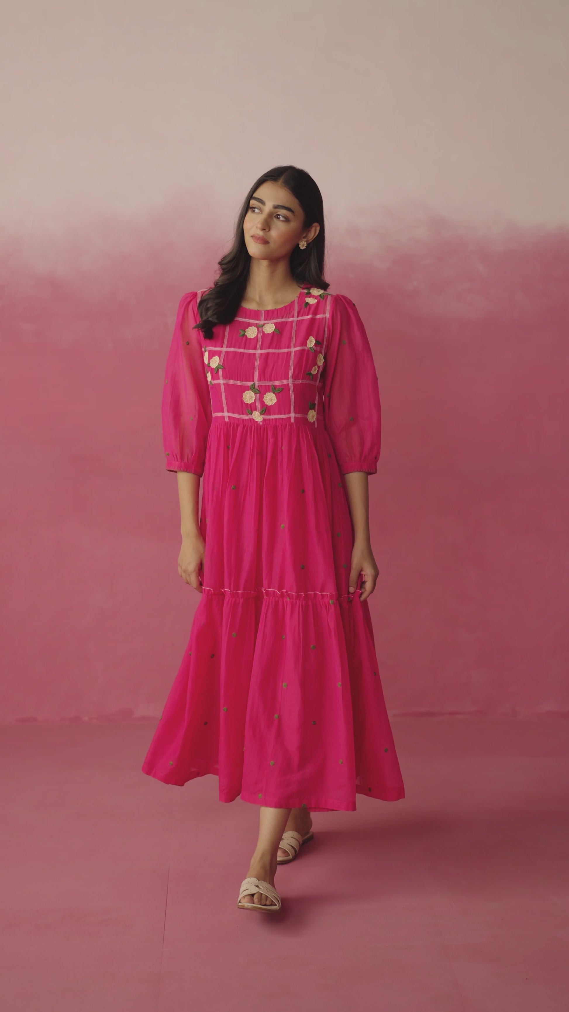 A vibrant fuchsia pink midi dress crafted in Chanderi. It features delicate floral embroidery on the yoke, gathered tiers, and airy three-quarter sleeves. Designed for comfort and movement, it’s perfect for slow mornings, festive afternoons, and everything in between.