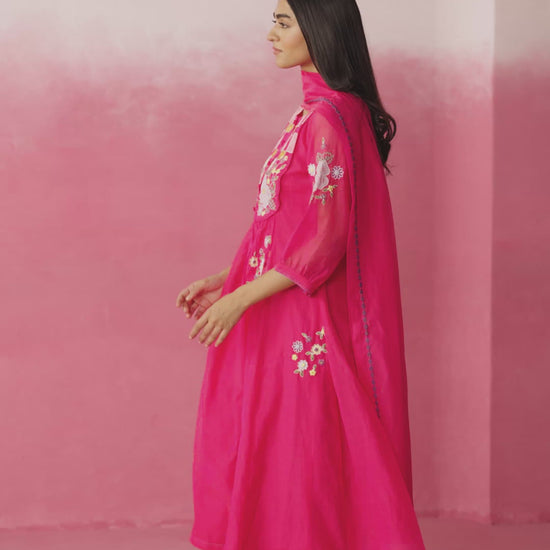 A lively fuschia pink ensemble that whispers of spring. The kurta features delicate floral embroidery on the yoke, sleeves, and hem — each motif crafted with care in soft pink and ivory threads. The gentle gathers below the embroidered panel add ease and flow, while the three-quarter sleeves with grid detailing lend a handcrafted charm. Paired with purple straight pants, this set is a perfect harmony of freshness and femininity — ideal for slow days, soft moods, and sunlit afternoons.