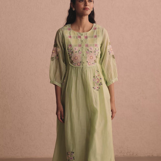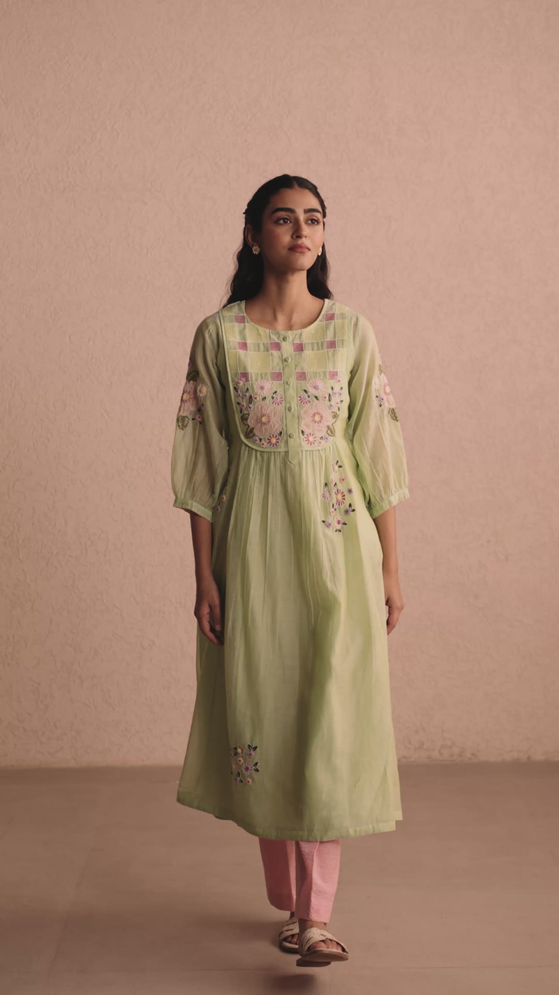 A soothing pastel ensemble that whispers of spring. This pistachio green kurta features delicate floral embroidery on the yoke, sleeves, and hem — each motif crafted with care in soft pink and ivory threads. The gentle gathers below the embroidered panel add ease and flow, while the three-quarter sleeves with grid detailing lend a handcrafted charm. Paired with blush pink straight pants, this set is a perfect harmony of freshness and femininity — ideal for slow days, soft moods, and sunlit afternoons.