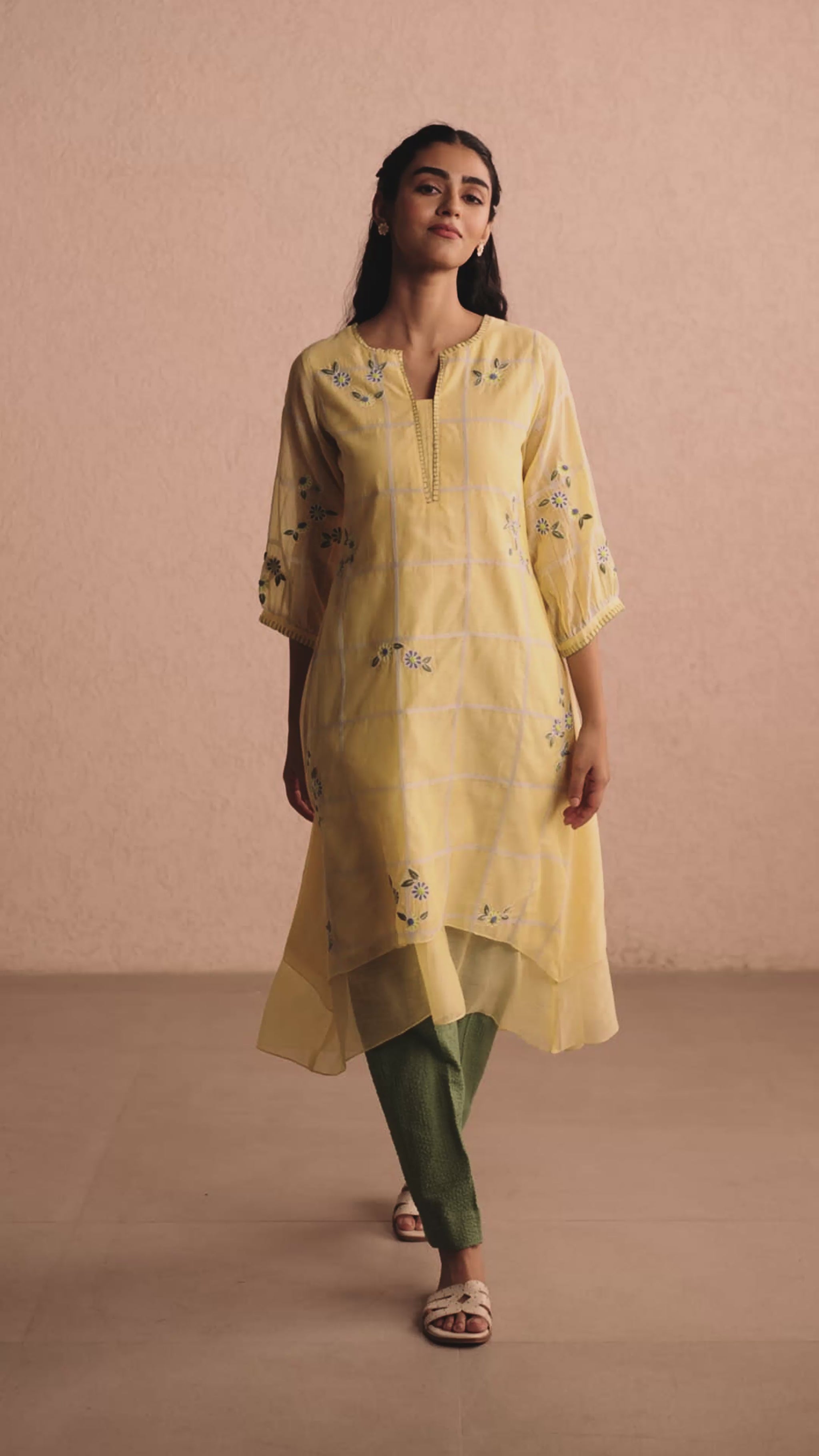 A gentle ode to sunny days, this lemon yellow kurta set captures the essence of effortless elegance. Crafted in soft handwoven chanderi, it features delicate white check patterns and floral hand embroidery in hues of blue and green. The straight silhouette with a layered hem and a modest slit neckline offers comfort with refined charm. Paired with textured green pants, this ensemble is perfect for quiet mornings, long lunches, or unhurried evenings — a timeless piece for your slow-living wardrobe.