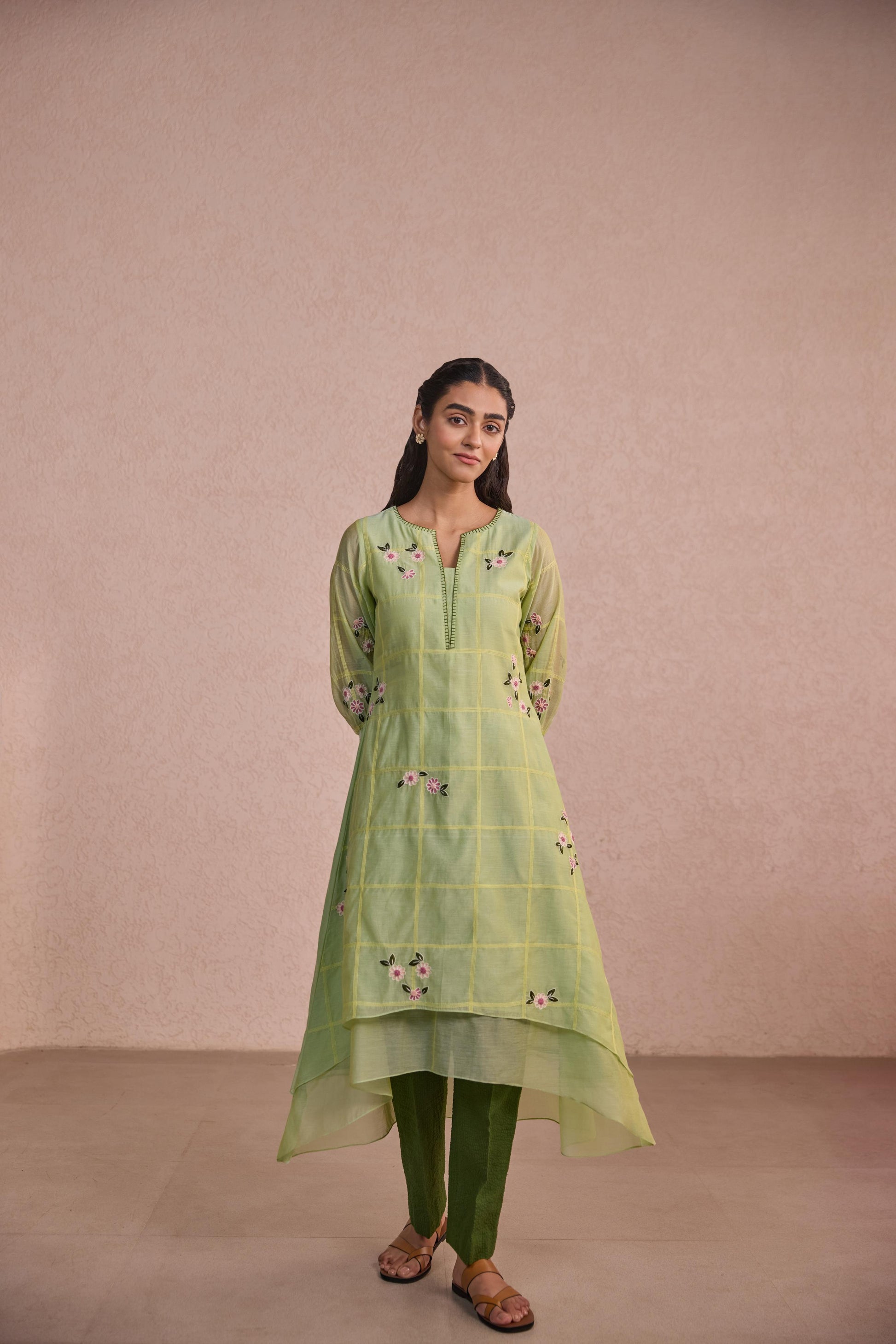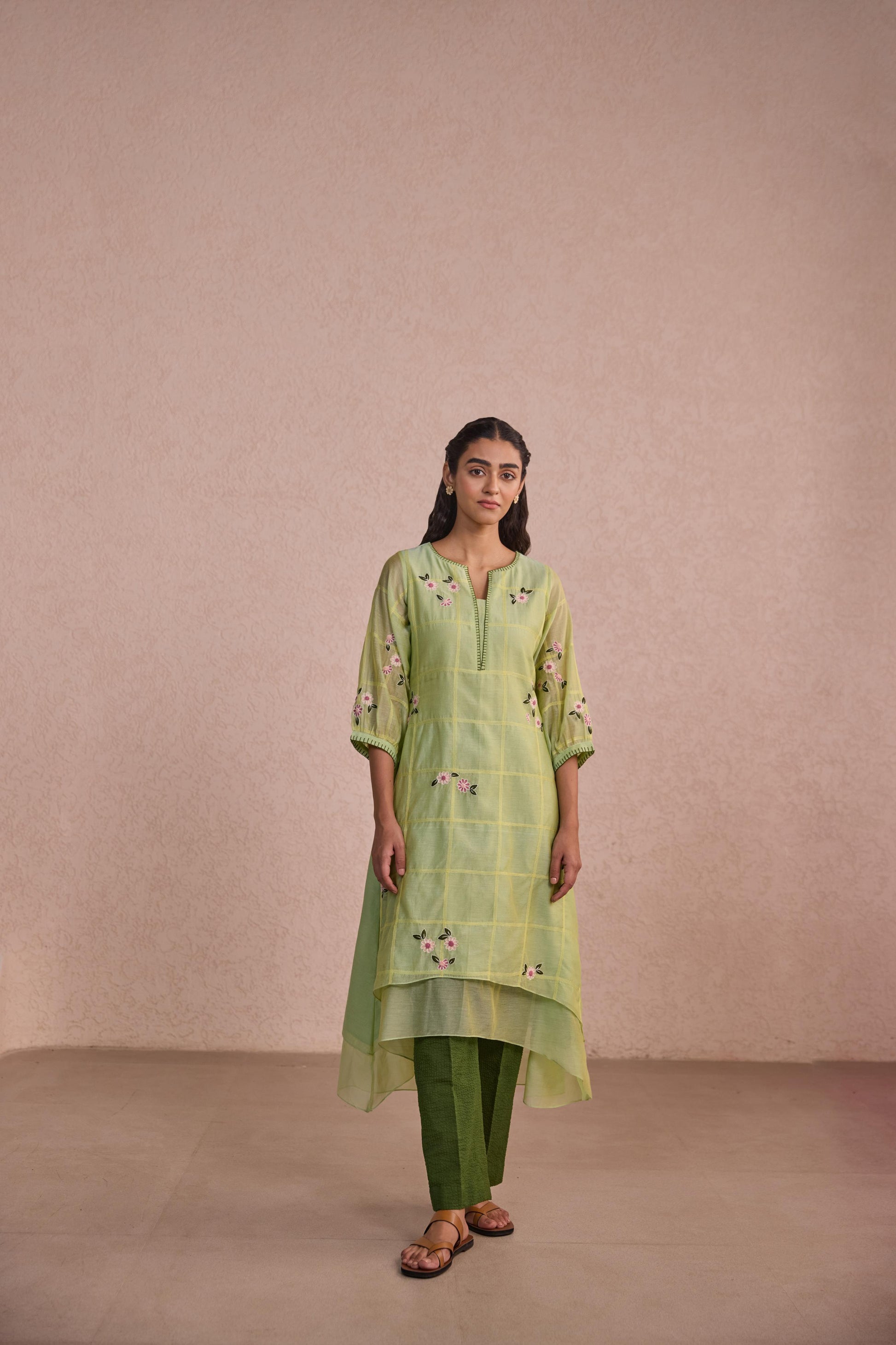 A gentle ode to sunny days, this lime green kurta set captures the essence of effortless elegance. Crafted in soft handwoven chanderi, it features delicate white check patterns and floral hand embroidery in hues of yellow and pink. The straight silhouette with a layered hem and a modest slit neckline offers comfort with refined charm. Paired with textured green pants, this ensemble is perfect for quiet mornings, long lunches, or unhurried evenings — a timeless piece for your slow-living wardrobe.