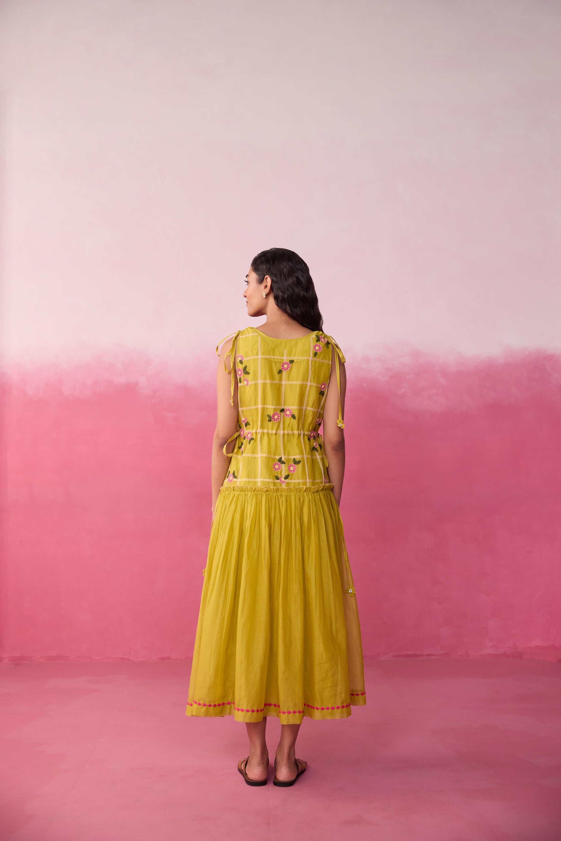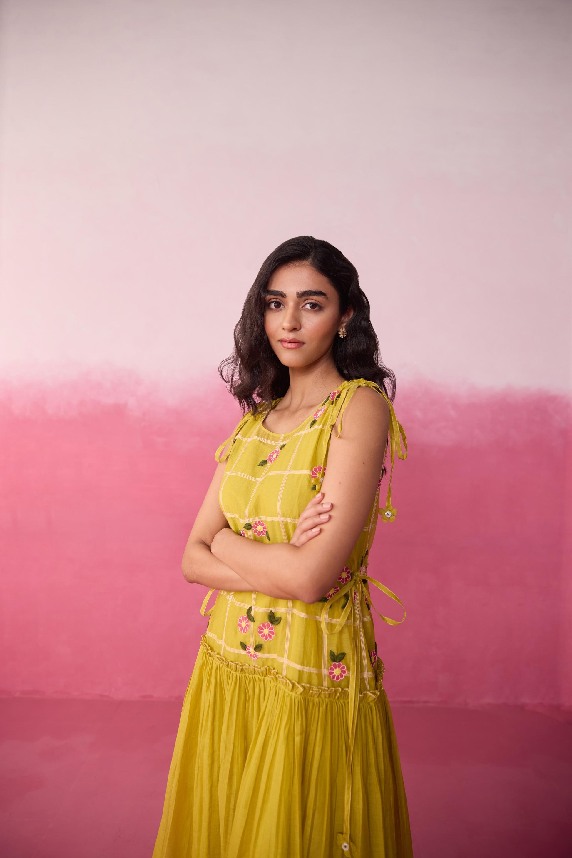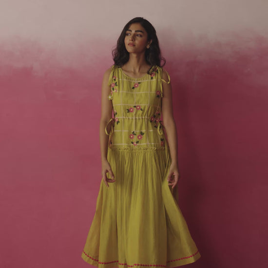 A breezy sleeveless dress in soft chanderi, detailed with delicate threadwork and dainty floral embroidery. The tie-up details at the sides add a touch of playfulness, while the gathered flare lends effortless movement. Finished with subtle handmade tassels and a hint of pink scallop at the hem, it’s a piece that celebrates everyday ease with quiet grace.