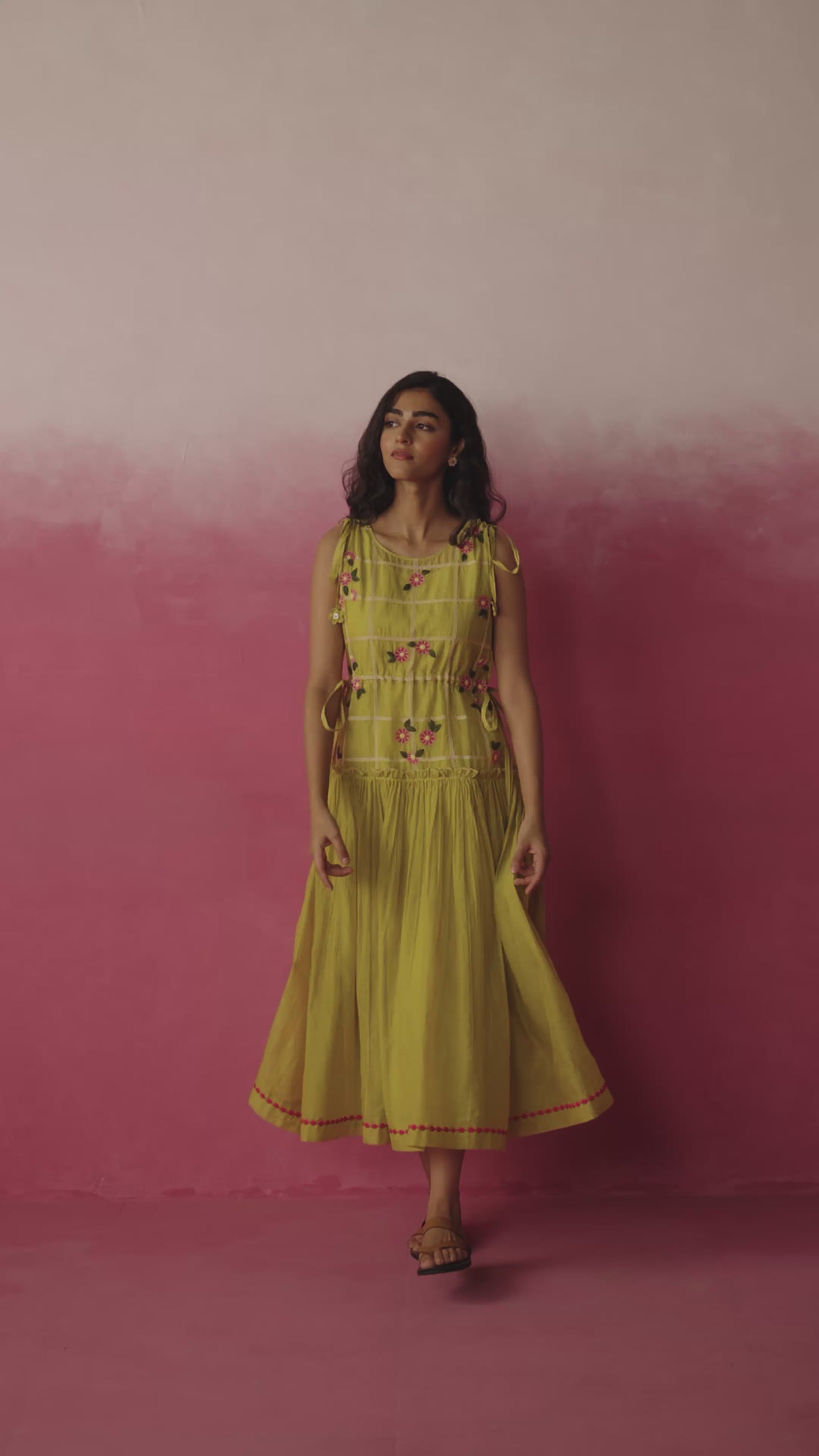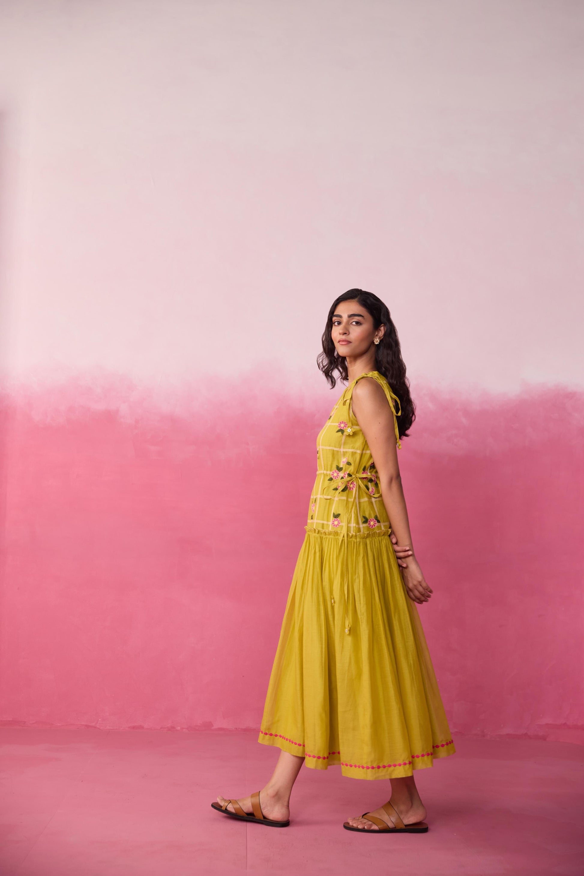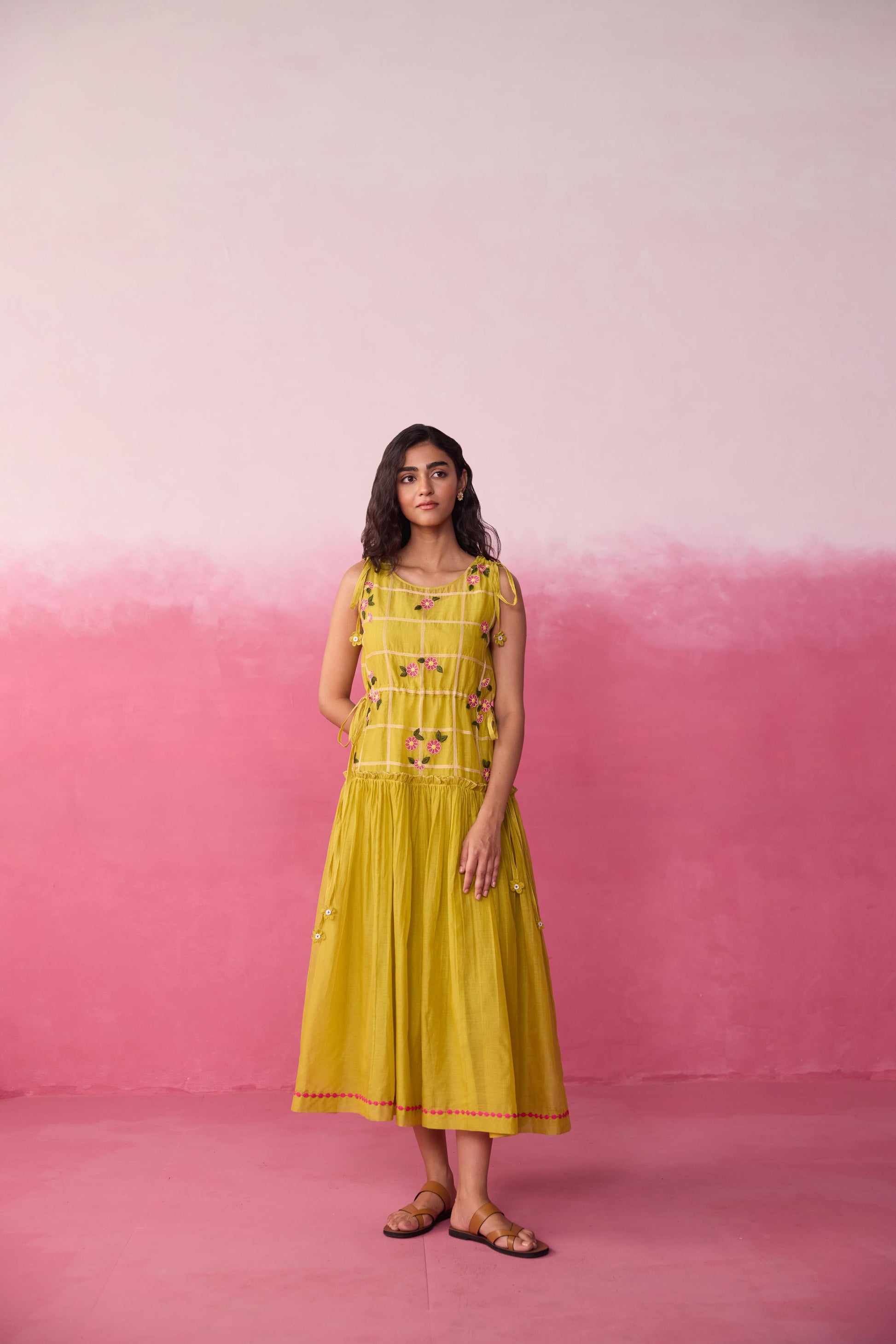 A breezy sleeveless dress in soft chanderi, detailed with delicate threadwork and dainty floral embroidery. The tie-up details at the sides add a touch of playfulness, while the gathered flare lends effortless movement. Finished with subtle handmade tassels and a hint of pink scallop at the hem, it’s a piece that celebrates everyday ease with quiet grace.