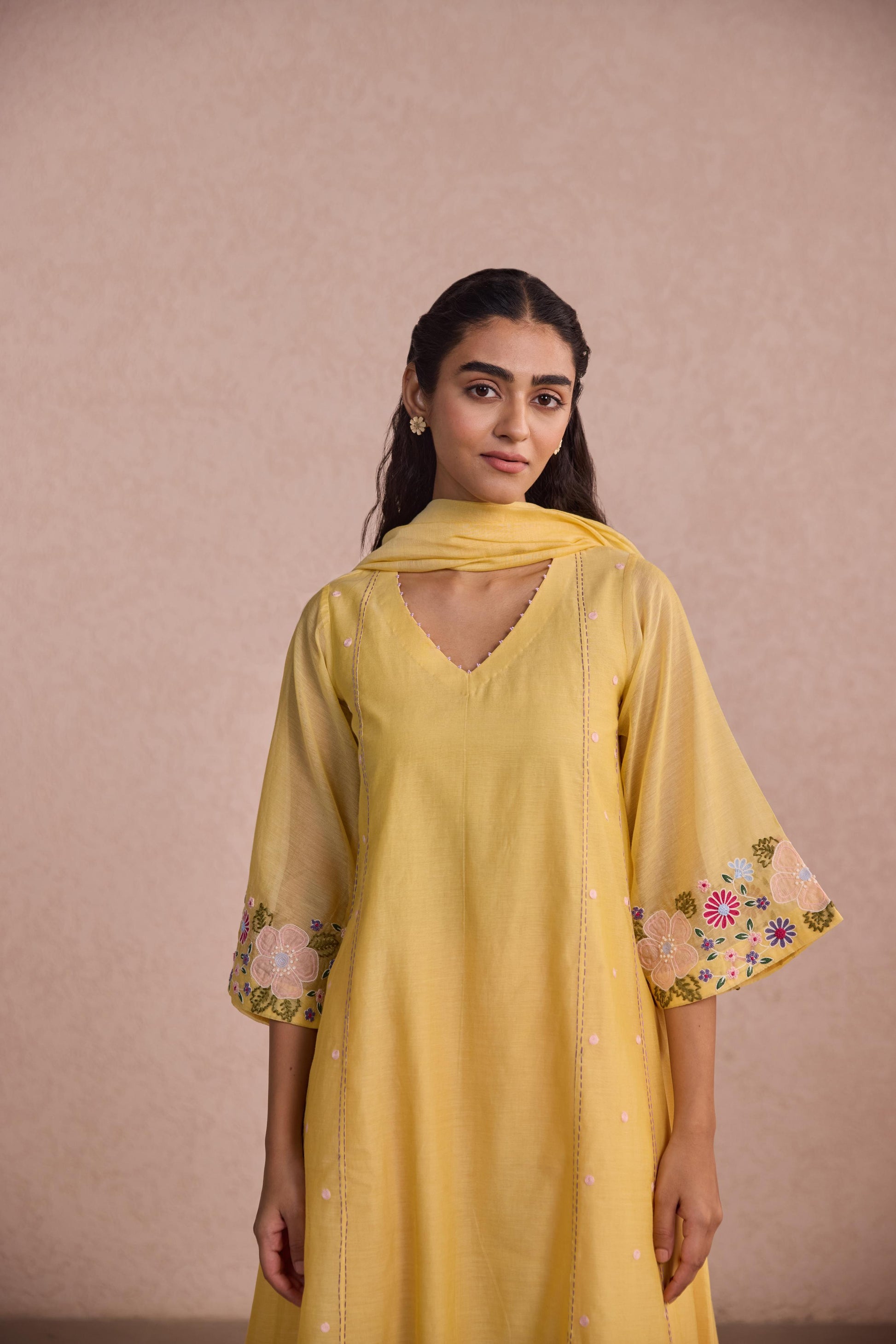 A soft burst of sunshine, this butter yellow kurta set exudes an easy, joyful grace. Crafted in breathable chanderi, it features a relaxed A-line silhouette with a delicate V-neckline. The statement bell sleeves are adorned with floral thread embroidery in pastel hues, adding a touch of playful femininity. Comes with a cotton pant in baby pink color, adding contrast and grace to the whole outfit.